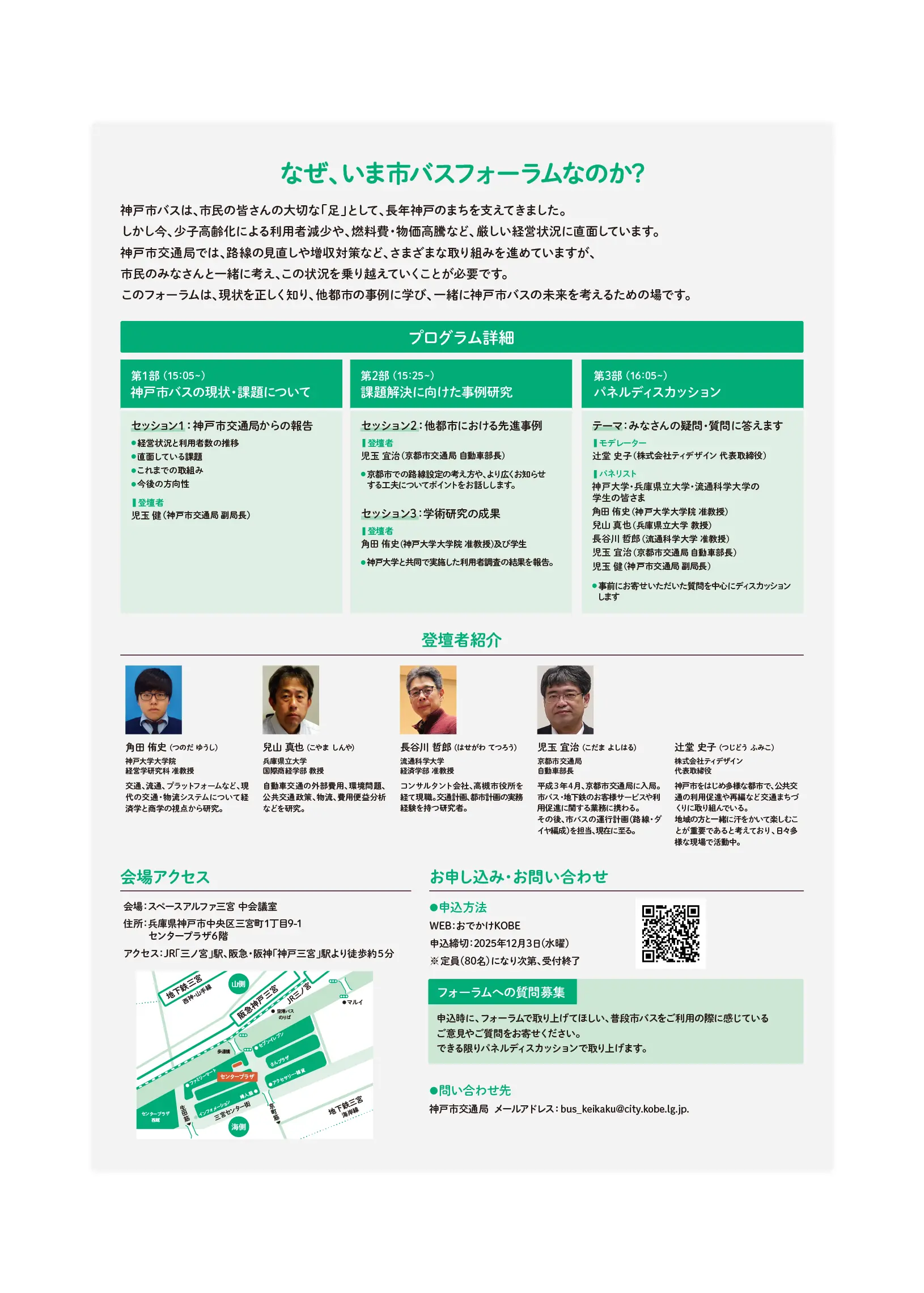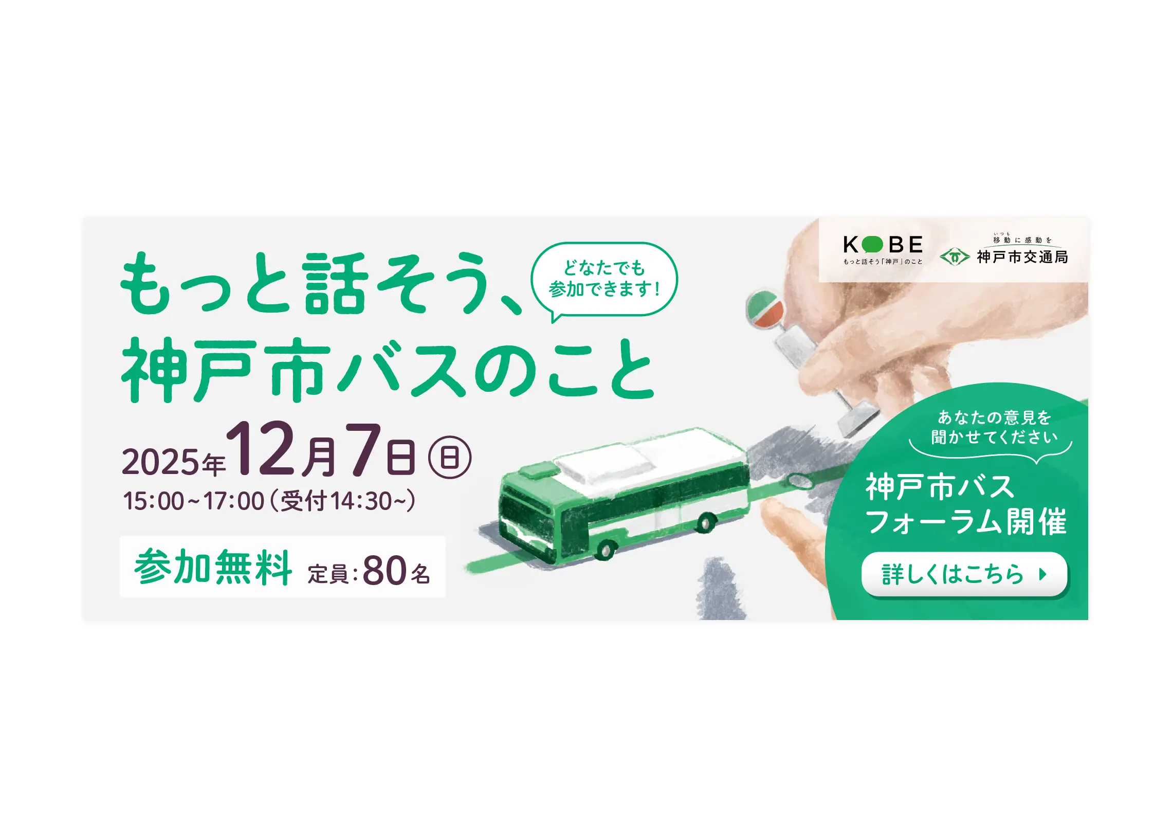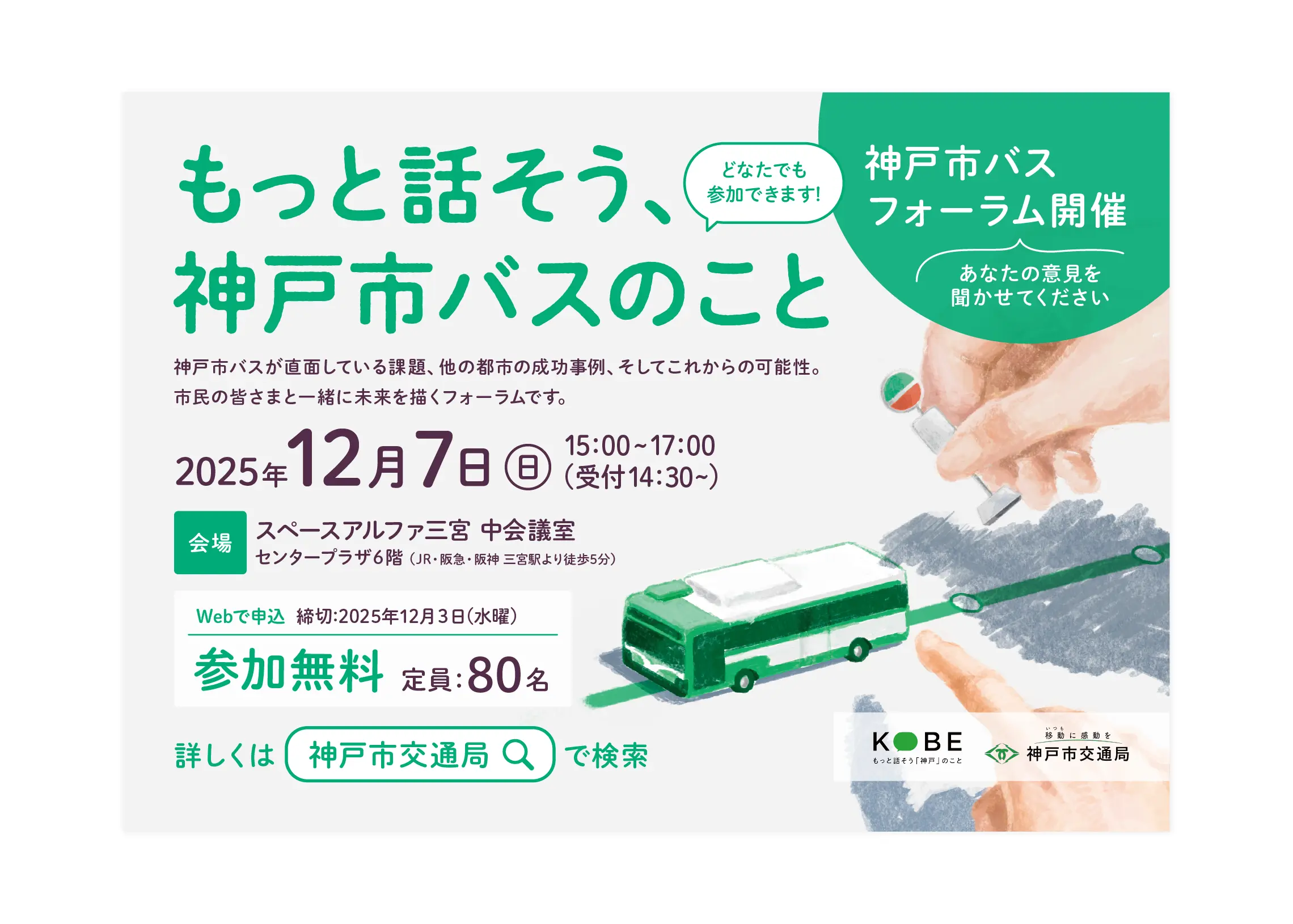 We created the application graphics for the user forum “Let’s talk more about Kobe City Bus,” organized by the Kobe City Transportation Bureau.