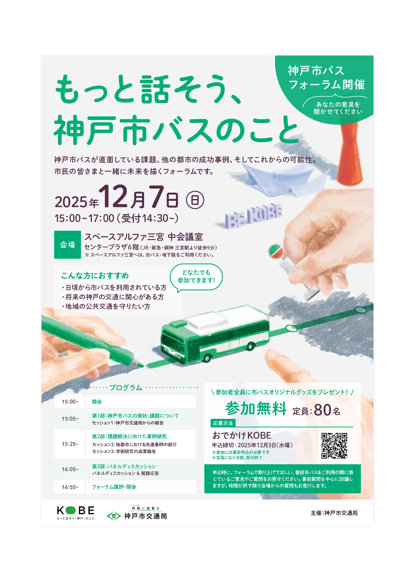 神戸市交通局が実施する、市バス利用者の声を集めるフォーラム「もっと話そう、神戸市バスのこと」のアプリケーショングラフィックを制作しました。